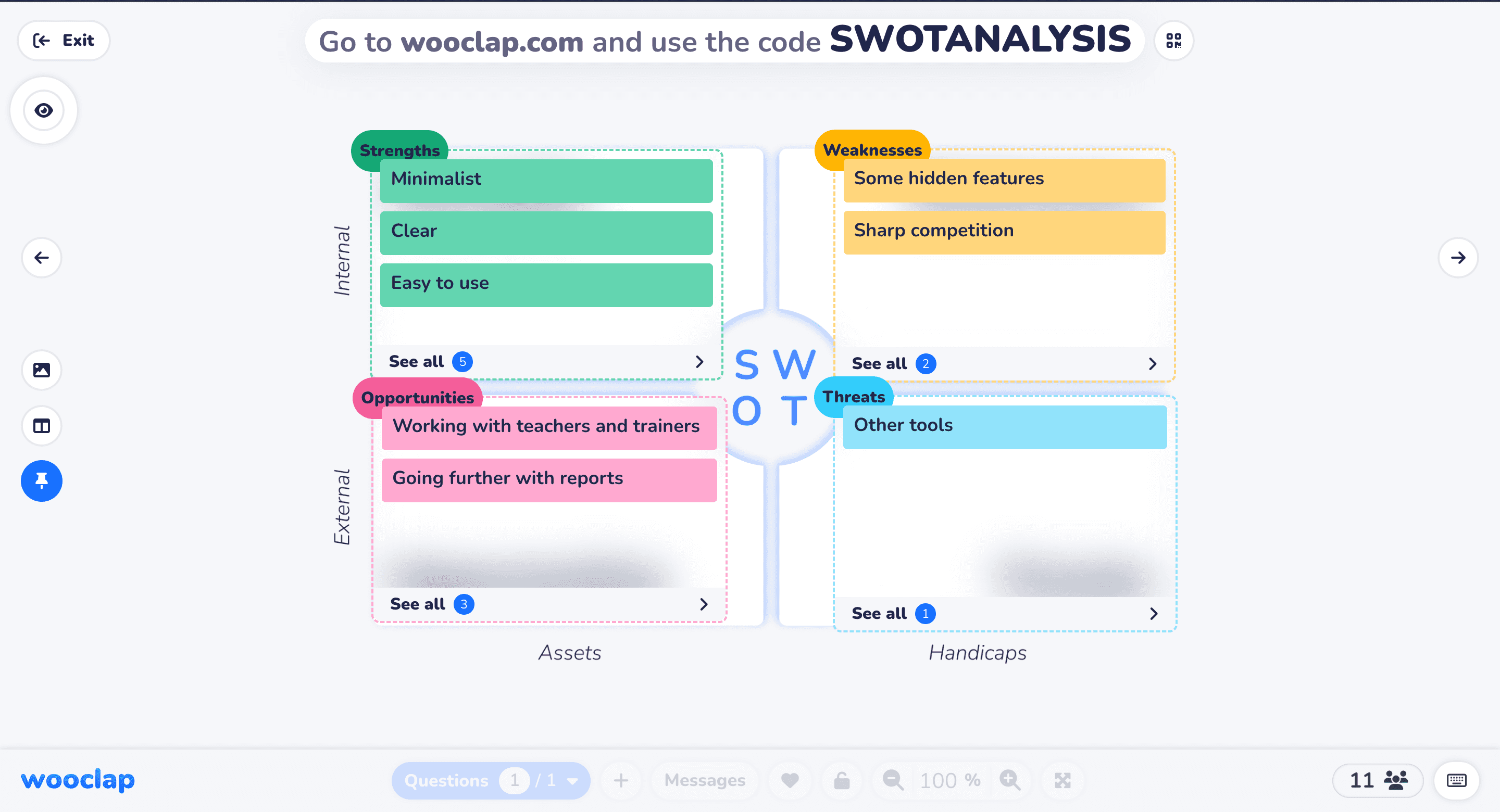 identified by our team. Alice, Product Manager at Wooclap, contacted these users to explore their current brainstorming practices in depth. Their discussions focused on how they conducted SWOT analyses, a widely used strategic method for evaluating strengths, weaknesses, opportunities, and threats.