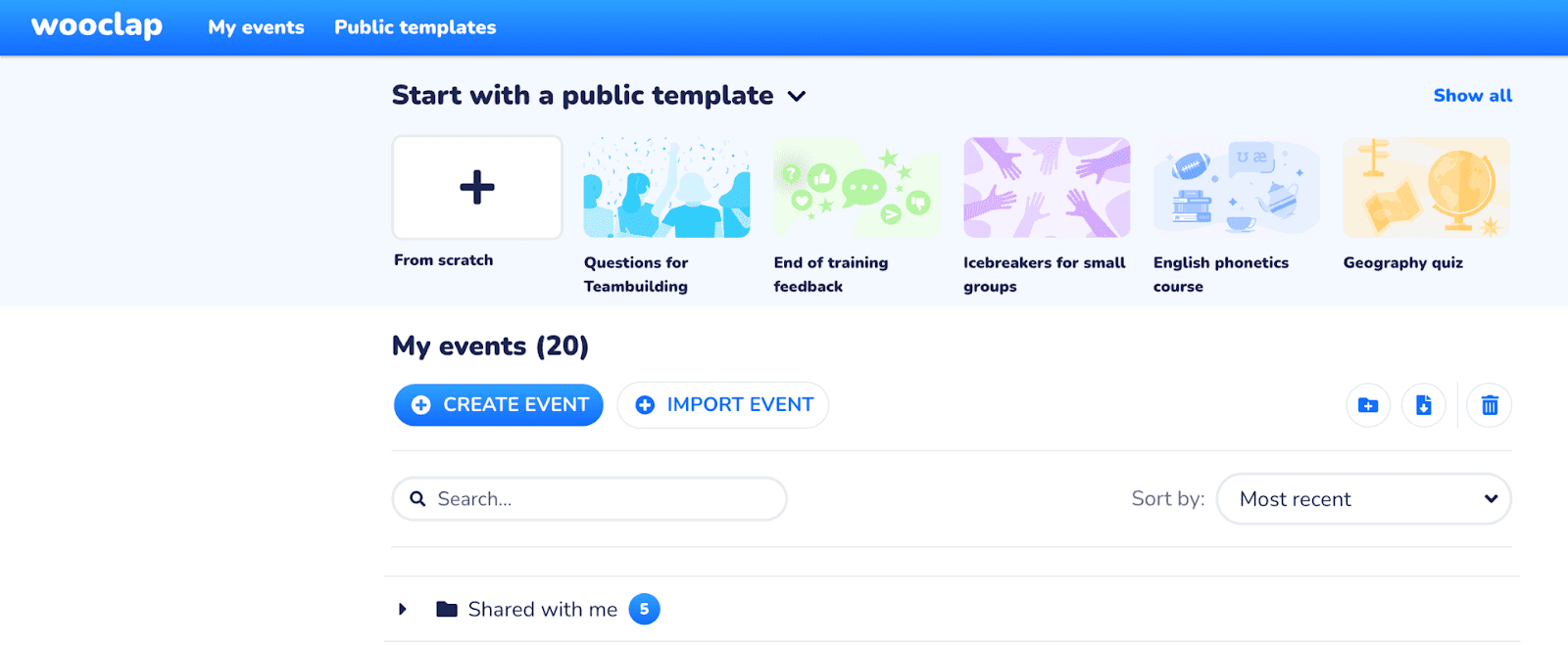 You can also access 5 templates directly from your Wooclap events page, at the top of the page, in the “Start with a public template” section.
