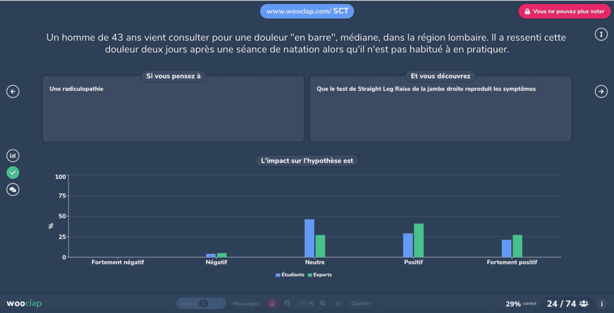 "Mes collègues et moi, qui formons nos étudiants au raisonnement clinique, nous intéressons depuis quelques temps déjà aux formations par concordance de scripts. Un des problèmes majeurs est la solution technique : difficile de trouver un outil qui calcule efficacement le score des étudiants en fonction des réponses d’experts, et surtout qui affiche de manière dynamique et visuelle les résultats de chaque question. Wooclap a pu répondre à mes besoins, et j’ai pu utiliser l’outil avec une cinquantaine de participants dans un congrès scientifique : tout s’est très bien passé. La prise en main est très intuitive, l’utilisation de l’outil à été idéale, c’est à dire transparente.